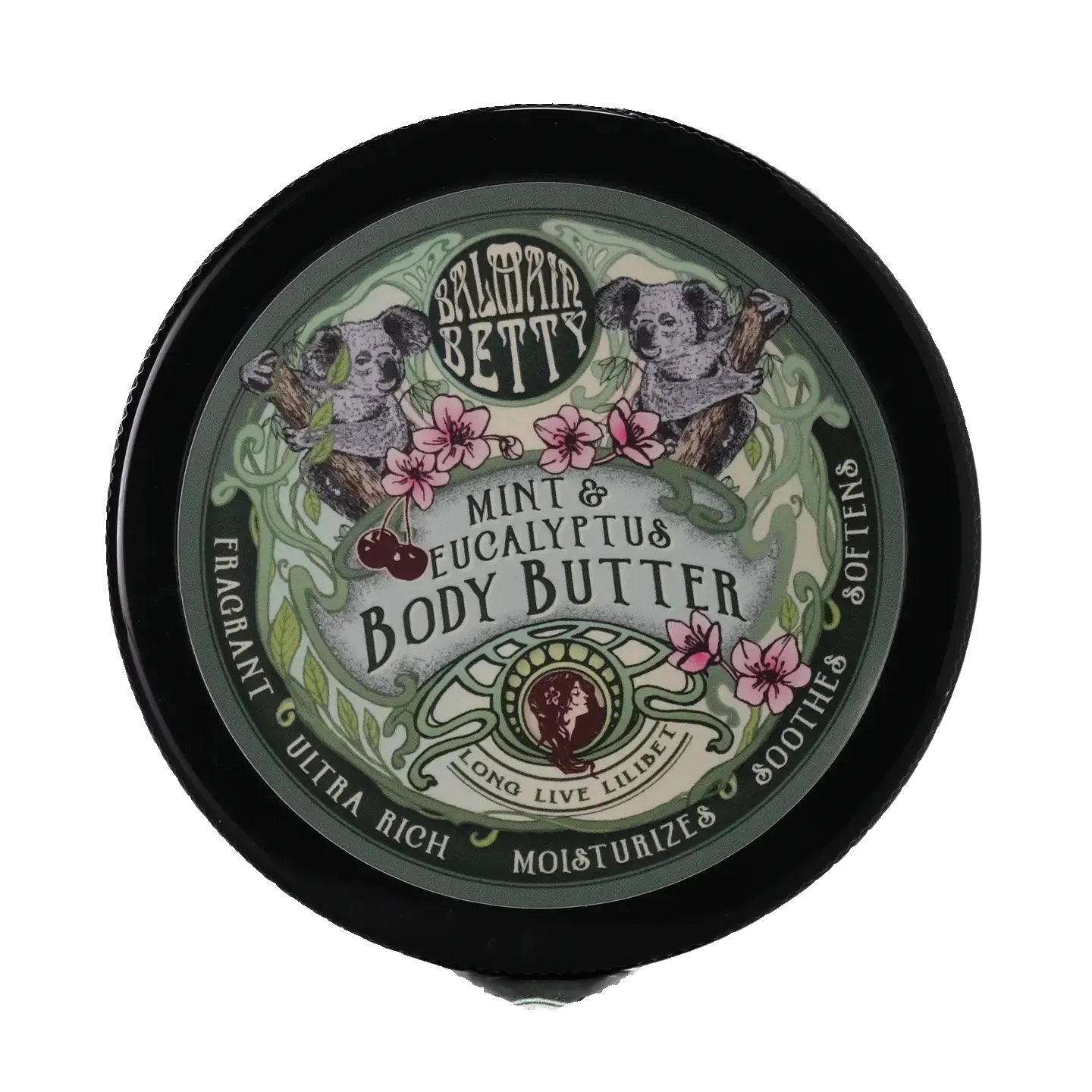 This ultra rich body butter scented with mint and eucalyptus is the perfect body cream for year-round, silky-smooth skin! Coconut oil, aloe vera and Vitamin E combine to replenish moisture and maintain hydration for all skin types. Never heavy, greasy or sticky, just a light and sheer with a powdery finish. Weight: 7.5oz Ingredients: Deionized Water, Coconut Oil, Hempseed Oil, Sunflower Oil, Vitamin E, Mineral Oil, Isopropyl Myristate, Cetyl Alcohol, Glycerol Stearate, Stearic Acid, Glycerin, Propylene Glycol, Cetereth-20, Carbomer, Aloe Vera, Disodium EDTA, Dimethicone, Petrolatum, Methylparaben Triethanolamine, Propylene Glycol, Diazolidinyl Urea, Iodopropynyl Butylcarbamate, Proplyparaben, Beeswax, Fragrance Essential Oil Blend Made in USA Long Live Lilibet!